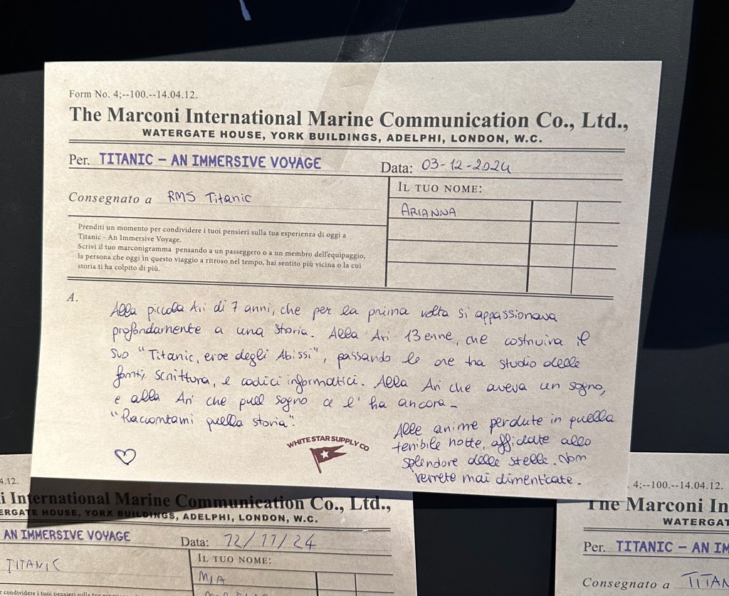 Se ci andrete, tenete in conto almeno un paio d’ore di immersione totale nella storia del transatlantico più famoso al mondo e della sua tragica fine. Verrete accolti da una zona introduttiva che vi presenterà i primi artefatti storici (in totale più di 300!) e alcuni abiti e oggetti di scena dal film di James Cameron del 1997 (è stata una sorpresa bellissima per me). Il viaggio prosegue con esposizioni e pannelli che raccontano della nascita del transatlantico, dalla progettazione a opera della White Star Line, storica rivale della Cunard Line, ai primi lavori nel cantiere irlandese dal 1909, fino a concludere con la realizzazione finale della nave in tutto il suo splendore. Da questo momento in poi l’immersione diventa ancora più realistica: accurate ricostruzioni permettono di continuare a osservare gli artefatti e a leggere i pannelli circondati da un ambiente che riproduce molto fedelmente gli interni della nave, un’esperienza che ho apprezzato tantissimo. Le parti finali della mostra, arricchiti da contenuti interattivi e molto suggestivi, sono dedicate ai tragici eventi che hanno portato all’inabissamento del transatlantico, dalla fatidica collisione con l’iceberg alle 23:40 del 14 aprile 1912 fino al momento in cui i pochi superstiti salvati dall’acqua e sulle scialuppe vengono accolti a bordo della Carpathia, giunta in soccorso del Titanic ben due ore dopo la scomparsa della nave sotto la superficie dell’Oceano del Nord Atlantico, avvenuta alle 2:20 del 15 aprile 1912. Ho realizzato un piccolo reel che trovate sul mio profilo Instagram che vi darà un’idea visiva di quello che ho cercato di riassumere qui!