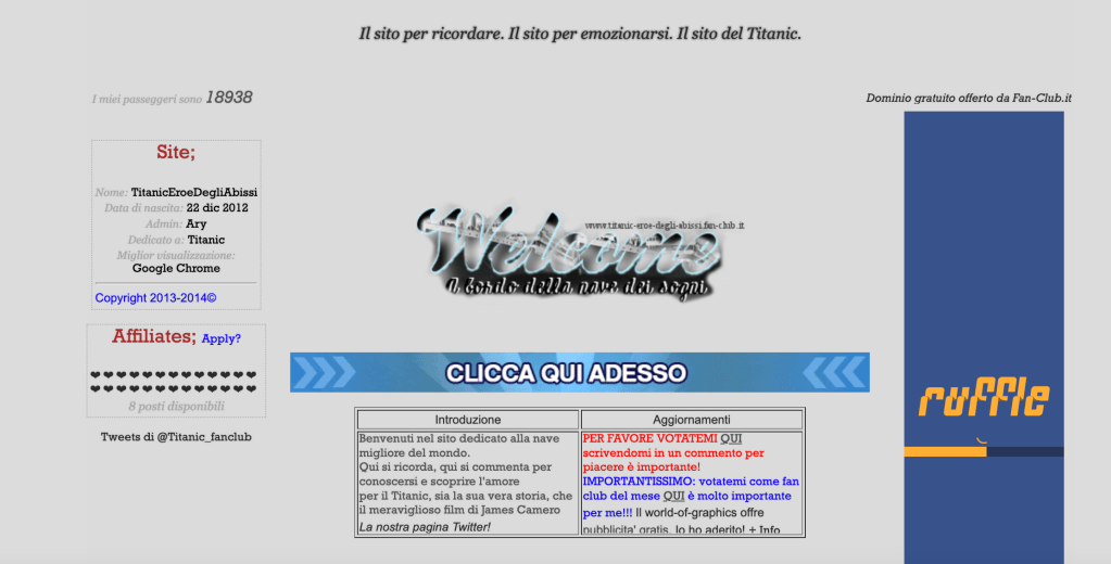 Anche questo Titanic, però, alla fine ha incontrato il suo “iceberg”: dopo appena un anno di attività del mio sito, il server che ospitava tutti i fan club ha chiuso improvvisamente a causa di problemi dell’host che ha deciso di non rinnovare il suo contratto in seguito a un evento spiacevole a opera di un utente maledetto. Ciò ha comportato la perdita di tutti i siti e di tutto il lavoro che avevamo fatto. Mi si è spezzato il cuore: ricordo ancora quel periodo come uno dei più felici e creativi della mia vita. L’unica testimonianza che ho sono alcune schermate da Wayback Machine, che vi lascio QUI!! per farvi vedere una delle tante facce che ha avuto il mio sito, a cui ero e sarò eternamente affezionata.