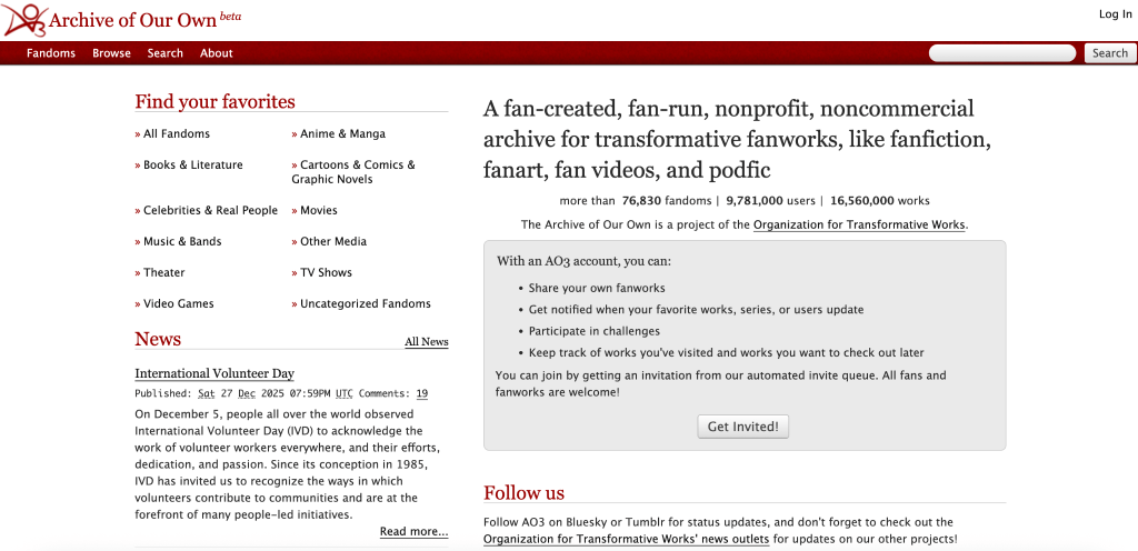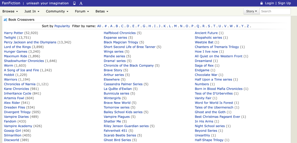 Negli anni sono nati anche archivi specifici per alcuni fandom più grossi. Per esempio, ricordo che ne esisteva uno sui One Direction (ora non c’è più); ne esistono ancora un sacco su Buffy l’ammazzavampiri (es. Twisting the Hellmouth), c’è Narutofic, o ancora Twilighted, e molti altri.